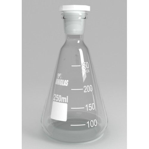 Frasco Erlenmeyer c/rolha de polietileno, graduado cap.100ml